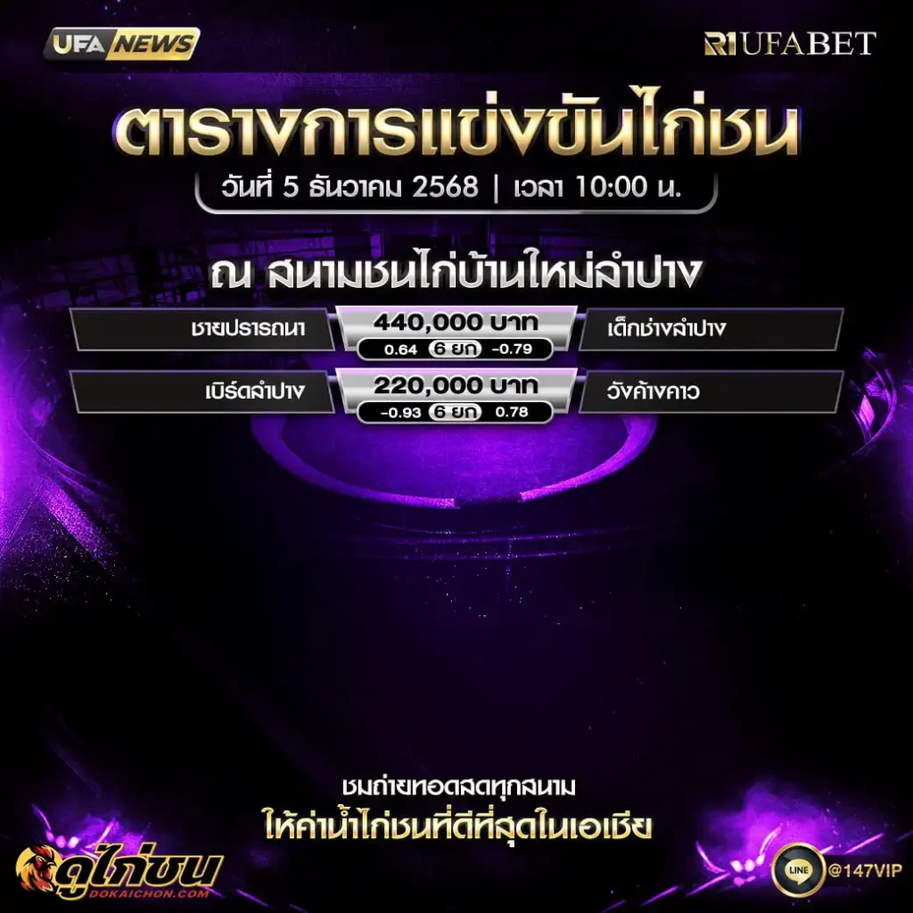 ตารางไก่ชน 05-12-68 สนามชนไก่บ้านใหม่ลำปาง ตารางไก่ชน 05-12-68 ตารางการแข่งขันไก่ชน วันที่ 5 ธันวาคม 2568 เวลา 10:00 น. สองคู่ไฮไลต์เงินเดิมพันรวมหลายแสนบาท คู่ที่1 ชายปรารถนา ชนกับ เด็กช่างลำปาง กำหนดชน 6 ยก เงินรางวัล 440,000 บาท ถือเป็นคู่ที่หลายสำนักมองว่าสูสีทั้งสายเลือดและฟอร์มการชน มีโอกาสลากยาวครบยกให้ลุ้นกันทุกอาวุธ ________________________________________ คู่ที่2 เบิร์ดลำปาง ชนกับ วังค้างคาว กำหนดชน 6 ยก เงินรางวัล 220,000 บาท แม้เรตเปิดใกล้เคียง แต่ด้วยสไตล์เข้าทำคนละแบบ ทำให้คอไก่ชนต่างเฝ้ารอดูว่าจะเป็นเกมเดินหน้าบู๊ หรือรอจังหวะสวนแบบเน้นคะแนน ________________________________________ สำหรับผู้ที่เดินทางไปเชียร์ถึงสนามชนไก่บ้านใหม่ลำปาง แนะนำให้เผื่อเวลาในการเดินทาง ตรวจสอบกติกาและข้อกำหนดของสนามให้ชัดเจน พร้อมทั้งเล่นอย่างมีสติ เพื่อให้สนุกกับบรรยากาศการเชียร์ และการชมเกมชนไก่ได้อย่างเต็มที่ตลอดทั้งวัน โดยแฟนไก่ชนสามารถใช้ ตารางไก่ชน เป็นข้อมูลประกอบการวางแผนเดินทาง และติดตามผลการแข่งขันในสนามจริงได้อย่างสะดวกครบถ้วน ติดตามข่าวสารไก่ชนได้ทุกวัน ที่นี้ DOKAICHON.COM ติดต่อสอบถามเพิ่มเติมตลอด […]